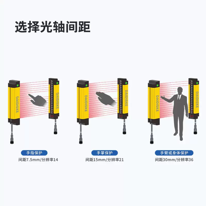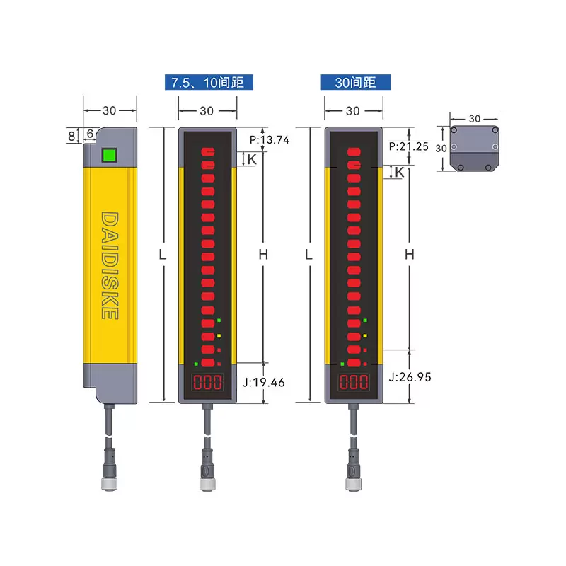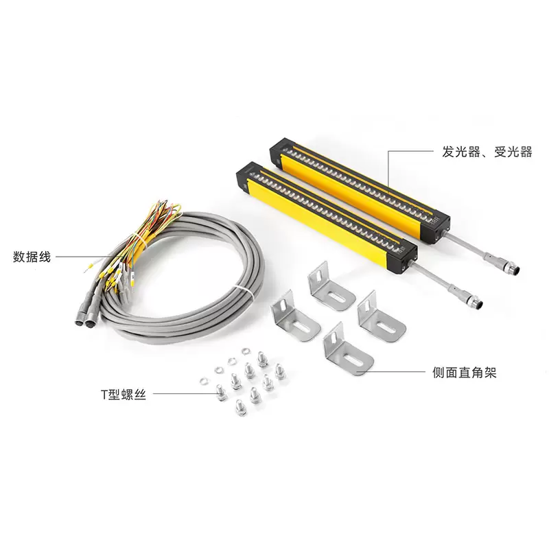 Optically, it adopts a collimated structure with an optional optical axis spacing of 7.5mm/15mm/30mm, corresponding to a resolution of 14mm/21mm/36mm, a detection distance of 0-6m, and a beam coverage of 15, 23-319 beams. The protection height is calculated as “optical axis spacing x (beam count -1)”. Response time ≤ 20ms, strong anti light interference ability, stable operation under 10000Lux ambient light conditions. The shell size is 30mm × 30mm × L, with aluminum alloy profiles and ABS end caps, and a protection level of IP65.