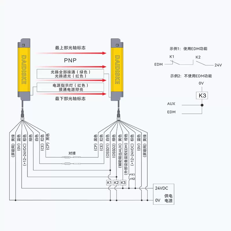 Controller model DQCA/DQCA2, power supply voltage DC12/24V, relay output side supports AC110-20V; The system power consumption is ≤ 200mA. The output supports two types: NPN/PNP, with a maximum input current of 500mA and residual voltage ≤ 1.5V. It also has polarity, short circuit, and overload protection. The power indicator light of the projector is red, and the light receiver is indicated by green/red LED to indicate the lighting, shading, and alarm status for quick diagnosis. The average time between dangerous failures (MTTFd) is 99a, with a working temperature of -10 ℃ to+55 ℃ and an environmental humidity of 20% to 85% RH. It is an ideal choice for upgrading safety protection in various stamping, sheet metal, packaging, and automated production lines.